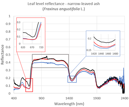 Figure 10. The reflectance of birch leaves sampled in June (18 June = DOY 169) representing two different developmental stages described in Figure 9. Mind the difference in the visible part of the spectrum related to lower chlorophyll content in juvenile leaves. The higher reflectance in NIR and SWIR in mature leaves is determined by more developed intercellular spaces that scatter NIR and higher content of structural compounds (cellulose).